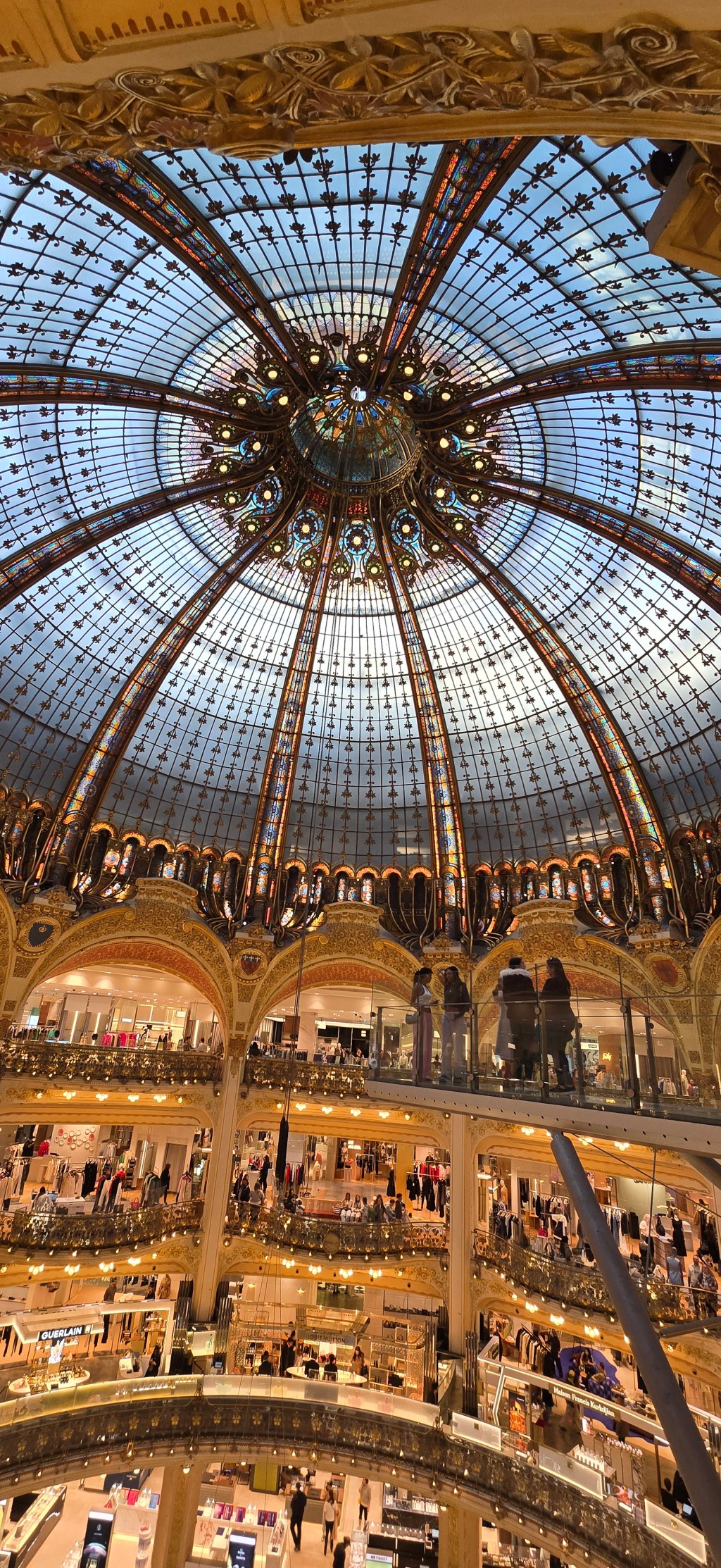 The building itself is an architectural attraction. In 1912, architect Ferdinand Chanut designed the store’s spectacular stained-glass dome, which rises approximately 43 metres above the central hall. The dome’s coloured glass panels filter daylight into the store below, creating a luminous interior that has become one of the most recognisable retail spaces in Paris.